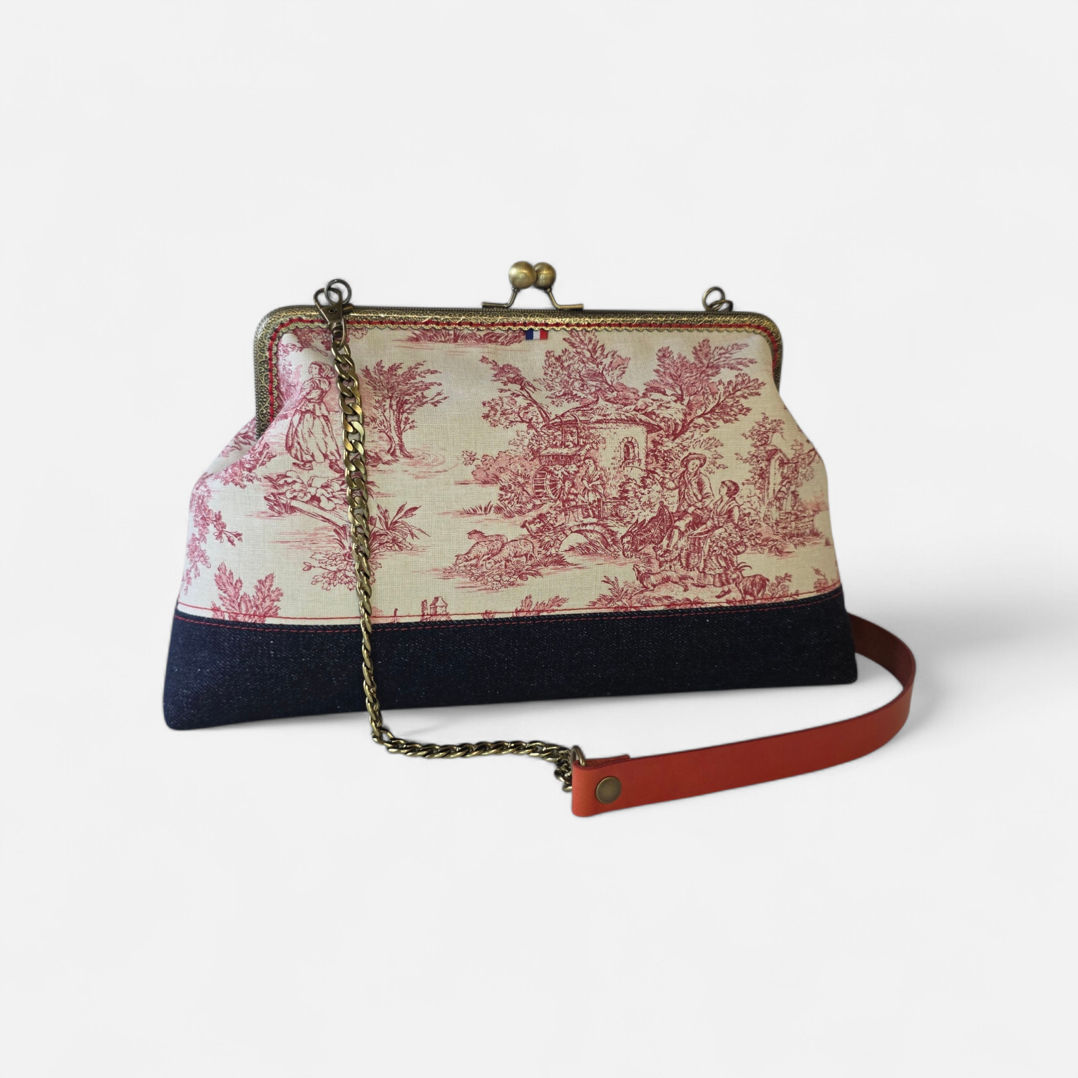 - Bandoulière : La partie chênette en aluminium maillon Gourmette, effet laiton Vieilli et la partie haute, sur l’épaule en cuir rouge tannage végétal.